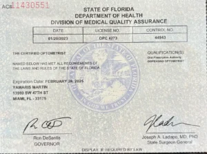 We are located in Florida and have been providing high-quality eye care services to the community since 2009. Led by board-certified optometrist Dr. Yamaris Martin, we offer a wide range of eye care services in Florida, including primary optometric care, contact lens fitting (including specialty lenses), glaucoma management, vision therapy, ocular emergencies, dry eye treatment, and myopia management.